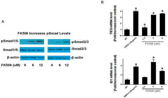 Figure 4. (A) FK506 increases BMP pSmad levels more than TGF-β pSmad levels. We treated C2C12 cells with FK506 (6 or 12 µM) and measured pSmad levels by Western blot 1 h after treatment. FK506 treatment resulted in a greater activation of the BMP receptor pSmad1/5 compared with the TGF-β receptor pSmad2 at both doses. (B) FK506 is capable of activating the early response genes. In order to interrogate the dose response and relative activation of BMP versus TGF-β signaling, we measured mRNA expression of early response genes in each pathway by RT-PCR. The data demonstrate induction of mRNAs for early response genes for BMP and TGF-β (Id1 and TIEG1) 1 h after exposure to Ligand (BMP-2 50 ng/mL or TGF-β 10 ng/mL) or FK506 in C2C12 cells. The 3 µM dose of FK506 was capable of Id1 or TIEG1 induction comparable to that of 100 ng/mL of BMP-2, but higher FK506 doses may preferentially induce signals that decrease BMP pathway activation, such as TGF-β. Statistical significance for a denotes comparison to the no-treatment controls.