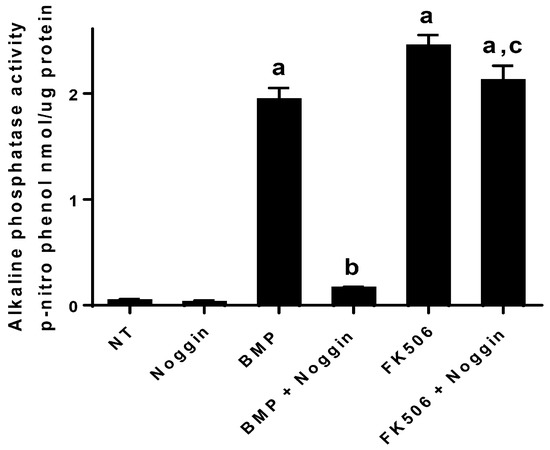 Figure 5 demonstrates that BMP-2 (50 ng/mL) and FK506 (6 µM) significantly increase alkaline phosphatase activity in C2C12 cells after a 72 h treatment (n = 3). BMP-induced alkaline phosphatase activity was significantly (p < 0.05) inhibited (~90%) by Noggin treatment (50 ng/mL) and was not significantly different from the control group (p < 0.05). On the other hand, the FK506 induction of alkaline phosphatase was resistant to Noggin treatment, showing a significant increase (p < 0.05) over NT controls and no significant difference to the FK506 treatment alone group.