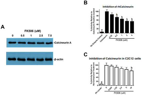 Figure 6. (A) FK506 has no effect on calcineurin A protein levels. We treated C2C12 cells with FK506 (0, 0.5, 1, 2.5, and 7.5 µM) and determined calcineurin A levels by Western blot after treatment of cells for 2 days. (B) FK506 treatment resulted in a dose-dependent inhibition of the phosphatase activity of a recombinant human calcineurin A in an in vitro assay described in “Materials and Methods”. Over 40% inhibition of enzyme activity was observed, even with a 2 µM concentration of FK506 (n = 3, p < 0.05) compared to the no-treatment group. Statistical significance (n = 3, p < 0.05) is denoted by a for comparison to the control group. Statistical significances (n = 3, p < 0.05) from the no-treatment control group to compound treatment groups are denoted by b. All determinations were performed in triplicate. (C) FK506 treatment of C2C12 cells also showed significant inhibition of calcineurin activity in cell lysates. An inhibition of over 27% was achieved with a 10 µM concentration of FK506 compared to no-treatment controls (n = 3, p < 0.05). Statistical significance (p < 0.05) is denoted by a for comparison to the control group. Statistical significances (p < 0.05) from the no-treatment control group to compound treatment groups are denoted by b.