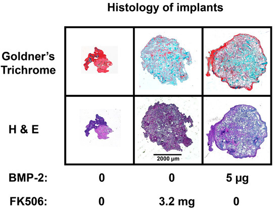 A minimal dose threshold for consistent ectopic mineralization is typical of all agents utilizing the BMP signaling pathway. The FK506 doses 2.4 and 3.2 mg and BMP-2 induced significant ectopic mineralization compared to NT controls (p < 0.05). However, there was no significant difference between those two doses of FK506 and implants treated with BMP-2, indicating comparable mineralization capabilities. Histological analysis (Figure 8) of the tissue by H&E staining and Goldner’s trichrome staining also demonstrates ectopic mineralization of the FK506-treated samples. 3.2 mg of FK506 delivered on the collagen sponge showed comparable mineralized tissue to 5 μg of BMP-2, showing corresponding effects as with the microCT data. This in vivo experiment in rats demonstrated for the first time that FK506 induces ectopic mineralization from scratch as a stand-alone agent, even in the absence of exogenous BMP-2.