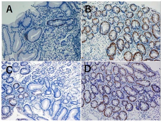 An endoscopic biopsy was performed to evaluate intestinal metaplasia, atrophy, neutrophil and mononuclear cell infiltration, and H. pylori scores according to the updated Sydney system []. These parameters were scored as follows: normal, 0 points; mild, 1 point; moderate, 2 points; and marked, 3 points. Biopsy specimens were obtained from the antrum and the middle corpus of the greater curvature based on our previous works [,,]. Incomplete metaplasia was also evaluated by hematoxylin and eosin staining. Histological findings were assessed and confirmed by two experienced pathologists without any disagreement.