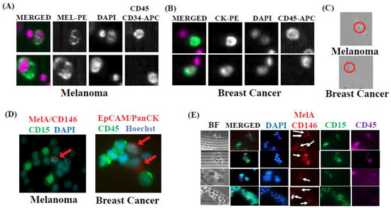 To elucidate interplays between CTCs and circulatory MDSCs, we used multi-parametric fluorescence activated cell sorting (FACS) to isolate putative CTCs and PMN-MDSCs from peripheral blood of patients diagnosed with metastatic breast and melanoma cancers (n = 15 and n = 18, respectively; the clinical-pathological parameters of patients enrolled in this study are provided) (Figures S1 and S2). CTCs and PMN-MDSCs were isolated in parallel from peripheral blood mononuclear cells (PBMCs) of the same patient sample. We used gating strategies previously reported to be successful for the isolation of putative CTCs [3,22,23]; along with FACS selection to obtain pure populations of PMN-MDSCs by employing established biomarkers for these cells [4,5,6,7,8]. Following red blood cell lysis, PBMCs were subjected to FACS and underwent doublet discrimination and dead cell elimination. Next, the CD45+ cell population was positively selected for CD33+/CD11b+, followed by CD14− and CD15+ selection to isolate PMN-MDSCs [4,5,6]. Conversely, the CD45− cell population was subjected to further depletion of “normal” cells using lineage-specific antibodies (CD34+/CD73+/CD90+/CD105+) to obtain lineage-negative (Lin-) cells. This was followed by the positive selection for either PanCK+ cells (breast cancer CTCs) [3] or CD146+/Melan-A+ cells (melanoma CTCs) [18]. Correct cell-surface biomarker selection and FACS procedures to isolate PMN-MDSCs and CTCs were confirmed by immunocytochemistry. Importantly, the presence of heterotypic CTC/PMN-MDSC clusters was detected with clusters captured by using either the FDA-cleared CellSearch® CTC platform (Menarini Silicon Biosystems, Huntington Valley, PA, USA; capture of heterotypic clusters from patient’s peripheral blood was achieved according to platform specifications) [3,22,24], or by cell filtration/microfluidic devices, e.g., Parsortix® (Angle Inc, Guildford, UK) (www.ANGLE.com) [25] and CellSieve™ (Creatv MicroTech, Potomac, MD, USA); coupled with high-definition immunofluorescence microscopy (Figure 1) [3].