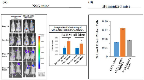 Metastatic competence of CTCs is significantly enhanced by co-transplantation of PMN-MDSCs isolated from the same patient in animals. (A) Representative images of mice injected intracardiacally with luciferase-labeled MDA-MB-231BR cells (Brc-Luc) cells, either alone or with unlabeled PMN-MDSCs (1.0 × 103 Brc-Luc cells vs. 5.0 × 105 PMN-MDSCs), followed by bioluminescence imaging at indicated times. Bioluminescence measurements of metastasis/BCBM per treatment of mice populations (n = 10/subgroup; * p < 0.05). (B) Detection of FACS-selected patient-derived CTCs (Lin−/DAPI+/CD146+/MelA+ cells) and PMN-MDSCs (Lin-/DAPI+/CD33+/CD15+ cells) obtained from blood of a representative melanoma patient injected in humanized mice, either alone (CTC Alone/PMN-MDSC Alone), or together (CTC + PMN-MDSC) (1.0 × 103 CTCs, vs. 5.0 × 105 PMN-MDSCs). Data show the percentage of live human melanoma CTCs (Lin−/CD146+/MelA+ cells) isolated from humanized murine blood 22 weeks following cell injection. Data represent the mean ± SD of six independent experiments (n = 6).