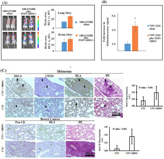 The detection of bioluminescence signal following the injection of human brain-metastatic breast cancer (MDA-MB-231BR) (A) (red circles refer to the detection of brain metastasis in mice) or melanoma (70W-SM3) mice (B) cells with or without co-transplantation with circulatory PMN-MDSCs isolated from blood of respective patients. Representative animals are shown (n = 3/subgroup; * p < 0.001). (C) CTC metastatic competence is increased by PMN-MDSCs. Patient-isolated CTCs were injected together with PMN-MDSCs derived from respective breast cancer or melanoma patient blood via intra-cardiac route. Following animal euthanization and tissue organ processing, tumor cells were detected in metastatic foci by histopathology staining using human tumor cell-specific markers as indicated. Animal lung tissues of four breast cancer or melanoma patients were analyzed following the injection of CTCs/PMN-MDSCs. Magnified images (100×) were captured and quantified by free-access Image J software using the reciprocal intensity (250-y) method [22]. Controls consisted of detection of human tumor cells in tissues of animals injected only with CTCs. Tissues of animals injected only with patients’ MDSCs stained negative for human tumor cell-specific biomarkers (data not shown).