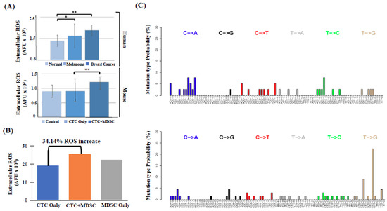 (A) The detection of significantly higher exogenous ROS levels in serum of breast cancer or melanoma patients compared to healthy donors (Normal) (n = 4; * p < 0.01; **p < 0.001) (Upper panel); or in serum of animals previously (6 days) injected with CTCs + PMN-MDSCs directly isolated from patients’ blood in parallel vs. CTC alone vs. no cell injection (Control) (n = 4; ** p < 0.001). (B) CTC/PMN-MDSC co-cultures contributed to significantly higher extracellular ROS (~35% increase; p < 0.001). CTCs/PMN-MDSCs from co-cultures were injected in mice and ROS levels compared to ones from mice injected with either CTCs or MDSCs alone (n = 8/subgroup). (C) Mutational signatures of M-MDSC (Lin+/DAPI+/CD33+/CD14+ (upper panel)) and PMN-MDSC (Lin+/DAPI+/CD33+CD15+ (lower panel)) cell populations by WES analyses.