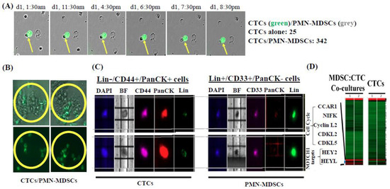 Following isolation of CTCs and PMN-MDSCs from patient blood by flow cytometry sorting, cell populations of a given patient were cultured individually or mixed together to generate CTC/PMN-MDSC co-cultures in a sphere-forming medium on low-attachment plates [8]. After four days of co-culture, CTC/PMN-MDSC clusters were picked-up from the culture wells using the robotic micromanipulator device of the CellCelector™ (ALS, Inc., Jena, Germany). Clusters were dissociated by brief Trypsin/EDTA treatment, stained and submitted for DEPArray analyses [3]. CTCs and PMN-MDSCs were distinguished by their specific expression pattern of tumor cell markers vs. CD45, CD33 and CD11b MDSC markers. CTCs were recovered from the DEPArray cassette, and their gene expression was then analyzed by microarray (Human Clariom D, Affimetrix, Inc., Santa Clara, CA, USA) [18]. CTCs of cultures without PMN-MDSCs were subjected to the same DEPArray/Microarray procedure for comparison (controls). Gene expression differences between control and co-cultured CTCs were evaluated on the Transcriptome Analysis Console (TAC).