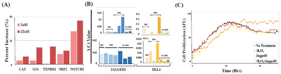 ROS generated from MDSCs is known to provide an immune privileged microenvironment for tumor cells and to promote tumor cell proliferation through the activation of the NRF2-ARE pathway [4,5,6,7]. Because NRF2-ARE upregulates Notch expression in cancer cells [31], we investigated the involvement of Notch in PMN-MDSC—CTC crosstalks. First, we found that treatment of patient-derived melanoma CTCs with hydrogen peroxide (H2O2) (0–25 µM)—a major component of ROS—caused a dose-dependent increase of NRF2 target gene expression along with downstream anti-oxidant CAT, GSS, and TXNRD1 effector genes (Figure 7A). Second, we observed that CTCs co-cultured with PMN-MDSCs had significantly higher levels of Notch1 gene expression, along with an increase of cell-cycle genes and Notch target genes HEY1 and HES1 [17,19]. However, in the presence of the NRF2 inhibitor ML385 (5 µM) [27], PMN-MDSCs could not induce Notch1 gene expression, suggesting that PMN-MDSCs upregulate Notch1 expression in CTCs by the NRF2-ARE axis. We posited that activation of the Notch signaling pathway involves the engagement of Notch1 receptor present on the cell surface of CTCs [3] with concurrent presence of Notch1 ligands Jagged1/DLL in PMN-MDSCs. We detected high levels of Notch1 ligands in PMN-MDSCs isolated from multiple patients (Figure 7B). We also detected signal heterogeneity and distinction of Notch ligands type, gene expression, and according to the brain-metastatic phenotype, although we could not reach statistical significance. However, the outcome of Notch/Notch ligand interactions was corroborated in vitro by augmented proliferation when CTC were exposed to a combination of H2O2 and Jagged1, compared to treating CTCs with H2O2 or Jagged1 alone. CTC proliferation, assessed in real-time (Incucyte™) and in 3D cell culture conditions using a modified sphere-forming media for CTC culturing [23], was augmented over time by oxidative stress and Jagged1 combinatorial treatment (Figure 7C).