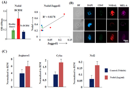 (A) Significant Nodal expression in serum of BCBM patients vs. patients with No BCBM but diagnosed with metastasis to other organs vs. healthy donors (Left panel). High correlation (R2 = 0.8178) between BCBM Nodal and PMN-MDSC Jagged1 expression in the same patient cohort type (Right panel). (B) Nodal expression positivity/heterogeneity in CTCs isolated from blood of melanoma patients by FACS. Staining was performed employing high-definition immunofluorescence (IF) microscopy, as previously described [3]. (C) Increased expression of Arginase1, Cyba, and Ncf2 gene expression by treatment of PMN-MDSCs with recombinant human Nodal (1 μg/mL) [35]. B2M = Beta 2 microglobin (control). Data shown are mean ± SD of four independent experiments (n = 4).