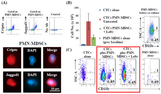 (A) Detection of Cripto/Jagged1 over-expression in PMN-MDSCs isolated from blood of BCBM patients by FACS followed by high-definition immunofluorescence (IF) microscopy. Single-cell images of a representative experiment (n = 4) are shown. (B) Co-cultures of CTCs with PMN-MDSCs isolated from BCBM patients not treated (red), or treated with Nodal inhibitor Lefty (green). CTCs (blue) or PMN-MDSCs cultured alone (grey, at baseline) represent negative controls. Data are mean ± SD of four independent experiments (n = 4). (C) Red frame shows PMN-MDSC transdifferentiation/phenotypic changes induced following co-culture with CTCs isolated from the same patient; however, changes were abrogated by incubation with Nodal inhibitor Lefty (1 µg/mL for 96 h at 37 °C) [34]. Ratios between CD11b+/SSC-A and CD11b+/SSC-A low are shown in a representative experiment (n = 4).