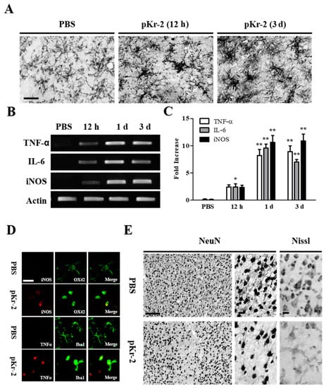 2.1. pKr-2 Induces Microglia/Macrophages Activation, Expression of Pro-Inflammatory Molecules, and Degeneration of Rat Cortical Neurons In Vivo