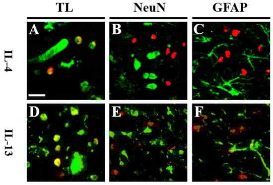 - Shin, W.H.; Lee, D.Y.; Park, K.W.; Kim, S.U.; Yang, M.S.; Joe, E.H.; Jin, B.K. Microglia expressing interleukin-13 undergo cell death and contribute to neuronal survival in vivo. Glia 2004, 46, 142–152. [Google Scholar] [CrossRef]