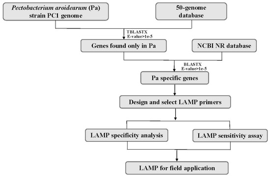 Standalone BLAST (version 2.6.0+) was set up on a Microsoft Windows PC system, and a BLAST alignment database was generated for each genome and the associated predicted gene database. The 4393 gene sequences of P. aroidearum were searched against the 50-genome nucleotide database using Standalone TBLASTX for the first round of screening. The e-value of 1e-5 was set as the threshold for homology. PERL scripts were used to parse the BLAST output files [35]. The genes having no matches with the 50-genome database were chosen for the second round of screening against the GenBank NR database using Standalone BLASTX. After the second round of screening, the genes satisfying the following conditions were selected: (i) With lengths ranging from 200 bp to 2000 bp; (ii) present in the P. aroidearum strain PC1, but not Pcc strain genomes in the NR database. These genes were considered as specific and chosen as candidate targets for designing LAMP primers (Table 1).