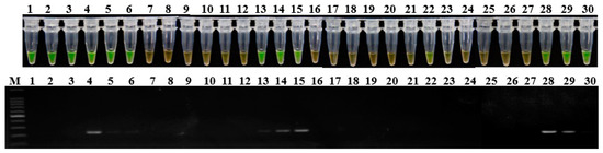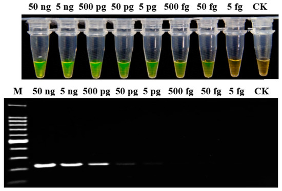 LAMP reaction mixture contained 1.6 µM each of FIP and BIP, 0.4 µM each of LF and LB, 0.2 µM each of F3 and B3, 1.4 mM each of dNTPs (TaKaRa, Dalian, China), 1 M betaine (Sigma, St. Louis, MO, USA), 1× isothermal amplification buffer (20 mM Tris-HCl, 10 mM (NH4)2SO4, 50 mM KCl, 2 mM MgSO4, 0.1% Tween-20, pH 8.8), 6 mM MgSO4, 8 U of Bst 2.0 WarmStart polymerase (New England Biolabs, Beverly, MA, USA), 1 µL of template DNA, and sterile deionized water to a final volume of 25 μL. For the negative control, sterilized deionized water was used to replace the DNA template. These reaction mixtures were respectively put into 200 μL centrifuge tubes, which were placed in a T100 Thermal Cycler (Bio-Rad Laboratories Inc., Hercules, CA, USA) at a constant temperature of 65 °C for 40 min. Then, the Bst 2.0 WarmStart polymerase was heat inactivated at 80 °C for 5 min to stop the reactions. When the reaction products were cooled, 1 µL of 1/10 diluted original SYBR Green I (Solarbio, Beijing, China) was added into every tube for color reaction.