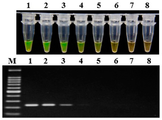 Sensitivity of LAMP (top) and conventional PCR assays (bottom) on artificially infected soil with P. aroidearum using primer set 1675-1. Lane 1–7: Serial 10-fold dilutions ranging from 1.2 × 108 to 1.2 × 102 CFU/g of artificially infested soil. Lane 8: Negative control. M: 100 bp DNA Ladder (TSINGKE, Wuhan, China).