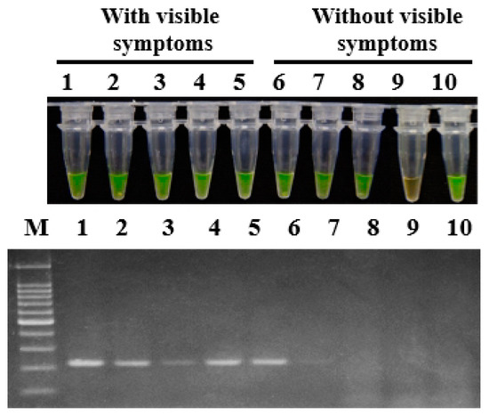 Application of LAMP and conventional PCR on naturally infected konjac corms. The konjac corm samples were collected from Yichang city, Hubei province in June 2018. The primer set 1675-1 was used in the assays for detection of P. aroidearum. Lane 1–5: Konjac corms with visible symptoms. Lane 6–10: Konjac corms without visible symptoms. M: 100 bp DNA Ladder (TSINGKE, Wuhan, China).