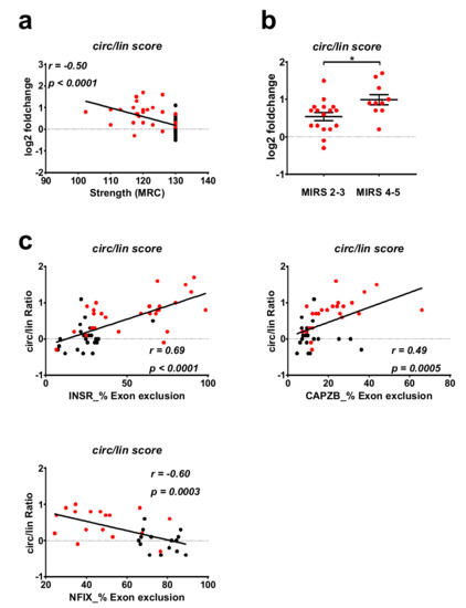 2.5. Correlation of DM1-circRNA Levels and Alternative Splicing Events