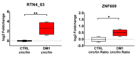 2.2. Validation by qPCR of Differentially Expressed circRNAs in DM1 Skeletal Muscles