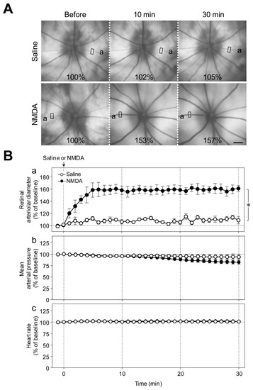 We first examined the effects of intravitreal injection of NMDA on the diameter of retinal arterioles, blood pressure, and heart rate. NMDA (6 nmol; Nacalai Tesque) was injected into the vitreous cavity of one eye of the rats. The same volume of the vehicle (saline) was injected into the vitreous cavity of one eye of the animals that served as a control. We found that NMDA at a dose of 6 nmol induced approximately 80% maximum response in preliminary studies.