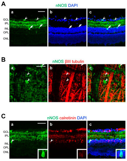 Localization of immunoreactivities of neuronal NO synthase (nNOS) in the retina. Confocal microscopy images of retinal flat-mounts and cross-sections labeled with anti-nNOS, anti-βIII-tubulin, or anti-calretinin antibodies. (A) Distribution of nNOS immunoreactivities. (a–c) Arrowheads and arrows indicate nNOS-positive cells in the ganglion cell layer (GCL) and inner plexiform layer (INL), respectively. (B) Co-localization of nNOS immunoreactivities with βIII-tubulin-positive ganglion cells. (a–c) Arrowheads indicate nNOS- and βIII-tubulin-double positive cells. (C) Co-localization of nNOS immunoreactivities with calretinin-positive amacrine cells. (a–c) Arrowheads indicate calretinin-positive amacrine cells with strong nNOS immunoreactivity. A higher magnification image of the cell is shown in the inset. Scale bars: (A–C) 50 μm in a (applies to b,c). DAPI, 4′,6-diamidino-2-phenylindole; IPL, inner plexiform layer; OPL, outer plexiform layer; ONL, outer nuclear layer.