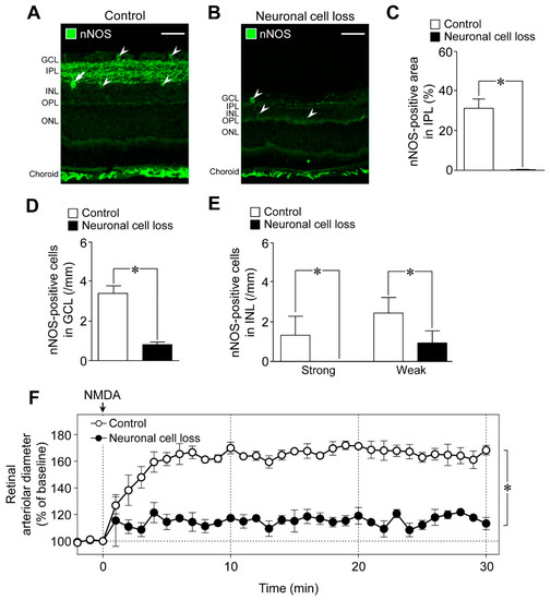 We next examined the role of neuronal cells in NMDA-induced response in the retina using the retinal neuronal cell loss model. The nNOS-positive area in the IPL and the number of nNOS-expressing cells in the retina decreased in the NMDA (200 nmol)-induced neuronal cell loss model, whereas nNOS immunoreactivities in the choroid remained unaltered (Figure 4A,B). Quantitative analyses indicated that the nNOS-positive area in the IPL, the number of nNOS expressing cells in the GCL, and the number of strong and weak NOS-positive cells in the INL were significantly reduced in the neuronal cell loss model (Figure 4C–E). Thus, we found that nNOS-expressing neurons are highly susceptible to NMDA-induced retinal injury. Compared with controls, NMDA-induced retinal vasodilation was markedly reduced in the neuronal cell loss model (Figure 4F). Our previous studies demonstrated that the responsiveness of retinal arterioles to NO remained unaltered in the neuronal cell loss model [6]. Therefore, the damage to retinal vascular cells could not explain the reduced NMDA-induced retinal vasodilation.