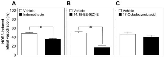 Glial cells can release vasoactive metabolites of arachidonic acid, such as vasodilators, for example prostaglandin E2 (PGE2) and epoxyeicosatrienoic acids (EETs), and the vasoconstrictor 20-hydroxyeicosatetraenoic acid (20-HETE) [9,10]. We found that the cyclooxygenase inhibitor indomethacin (10 nmol), and the EET analog 14,15-epoxyeicosa-5(Z)-enoic acid (14,15-EE-5(Z)-E, 0.7 nmol) attenuated the retinal vasodilation induced by intravitreal injection of NOR3 (5 nmol). However, we did not observe any reduction in the NOR3-induced response by the inhibitor of ω-hydroxylase 17-octadecynoic acid (1.4 nmol) (Figure 7). These results suggest that NO stimulated the glial cells to release vasodilatory metabolites, i.e., prostanoids and EETs.