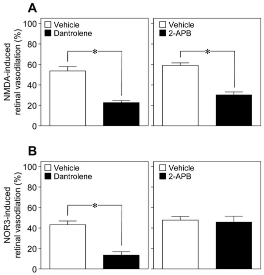 An increase in the intracellular Ca2+ concentrations activates phospholipase A2, which converts membrane phospholipids to arachidonic acid. Arachidonic acid, in turn, is subsequently metabolized to prostaglandins and EETs. In addition to Ca2+ influx from extracellular spaces, Ca2+ is mobilized within the cells from intracellular Ca2+ stores through two types of Ca2+ release channels: ryanodine receptors and inositol 1,4,5-trisphosphate (IP3) receptors. The ryanodine receptor antagonist dantrolene [11] and the IP3-induced Ca2+ release inhibitor 2-aminoethoxydiphenyl borate (2-APB) [12] reduced the NMDA (6 nmol)-induced dilation of retinal arterioles (Figure 8A), whereas dantrolene, but not 2-APB, prevented NOR3 (5 nmol)-induced retinal vasodilation (Figure 8B).