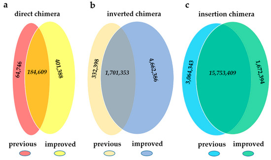 The comparison of two pipelines on MDA1. (a) direct chimera; (b) inverted chimera; (c) insertion chimera.