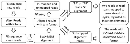 Firstly, we achieved clean reads by removing the raw reads with N base. The clean data was mapped to the human reference genome hg19 by using BWA alignment software with BWA-MEM algorithm in paired-end mode. The alignment results were saved as SAM format [38] and the aligned detail information was explored. We removed the properly paired-end aligned read pairs and unmapped reads from the SAM file. By analyzing the SAM FLAG value [38], read pairs aligned to the same strand were classified as insertion chimeras, and the soft-clipped alignment reads were retained for the following analysis by unscrambling the SAM CIGAR information [38] (Figure 3).
