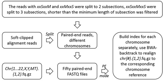 Meanwhile, any soft-clipped sequences which contained subsections shorter than 8 bp were removed due to the large probability of multiple alignment. Then, the reconstructed data were mapped to hg19 with BWA-backtrack in paired-end mode [29]. (Figure 4). The format of reconstructed pair-end reads was show in the Figure S1 in Supplementary Materials.