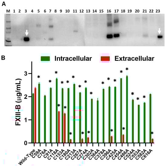 Transient expression of FXIII-B Cysteine mutants. Panel A. A conventional western blot of 10uL each of the wild type FXIII-B and 20 rFXIII-B cysteine mutants retained from the culture medium of transfected cells, probed against mouse to human FXIII-B antibody. Lanes: 1: Un-transfected control; 2: C76A; 3: Wild-Type; 4: C364A; 5: C396A; 6: C425A; 7: C454A; 8: C524A; 9: C553A; 10: C582A; 11: C616A; 12: C486A; 13: C378A; 14: C59A; 15: C91A; 16: C118A; 17: C153A; 18: C180A; 19: C213A; 20:C267A; 21:C274A; 22: C302A; and 23: rFXIII-B (Zedira, 75ng, positive control) White arrows represent the wild-type FXIII-B. Panel B. A comparative bar-plot representation of the antigenic levels of FXIII-B cysteine mutants versus the FXIII-B wild type evaluated on a quantitative sandwich ELISA based platform, detecting FXIII-B in 100µL of sample retained from transiently transfected cells. Green and red bars represent the intracellular and the extracellular fractions, respectively. A “*” symbol represents significance (p-value < 0.05).