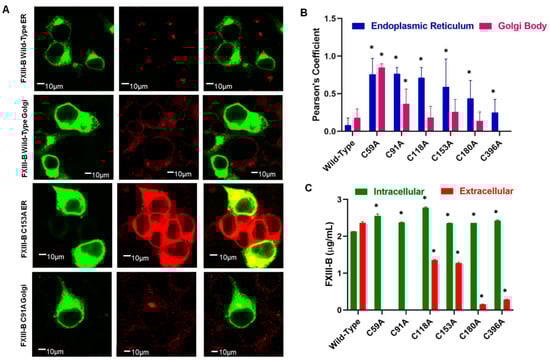 Subcellular distribution of the selected FXIII-B protein cysteine mutants evaluated by confocal microscopy showed significant intracellular retention when compared with wild-type FXIII-B protein (Figure 2A,B). The retention was primarily observed in ER (C59A, C91A, C118A, C153A, C180A, and C396A) with only two mutants showing higher detectable levels in trans-Golgi body (C59A and C91A) (Figure 2C). Classically secreted proteins usually attain their primary secretable folds in the ER, after which they are transported to the Golgi apparatus to be subsequently secreted. In the event of misfolding, exposed hydrophobic patches on the unfolded protein are detected by the quality control system of the cell, and these proteins are subsequently degraded via the ubiquitin response pathway. The two mutations i.e., C59A and C91A which show Golgi retention also show high retention in the ER (Figure 2B). These cysteine mutants possibly override the ER quality control system but then are returned back by Golgi through retrograde transport and subsequently degraded []. The C59A and C91A mutations, therefore, show no detectable secreted protein at all (Figure 2C). The remaining mutants show accumulation in ER, but their levels in Golgi are similar to that of the wild type. This suggests that these cysteine mutants to some degree escape the ER-mediated stress response and the molecules that do make it to the Golgi are successfully secreted outside. These mutants, therefore, show low but detectable amounts of secreted protein. Clearly, disrupting different disulfide bonds affects the overall fold of the protein differently which then dictates their intracellular as well as extracellular fates. Our previous expression study on two of the reported cysteine variants also reflected this diversity, since the C25R mutant (C5R; earlier nomenclature) was observed to get strongly retained in ER and also showed no detectable secreted protein while the other C336F (C316F; earlier nomenclature) mutant was not significantly retained in either ER or Golgi and hence also showed low but detectable amount of secreted [,]. Another mutant, i.e., C450F (C430F; earlier nomenclature) reported and analyzed previously in BHK cell lines also showed strong retention in the ER by pulse-chase experiments and no secreted protein []. The C336F variant though also showed lower levels of intracellular distribution in both ER and Golgi unlike for almost all variants that we have studied which uniformly showed higher levels of intracellular retention than the wild type. As also explained in our earlier study this difference might originate from the fact that in the case of the C316F (C336F; current nomenclature used in this study), the mutation might have resulted in slower folding rates for the final protein.