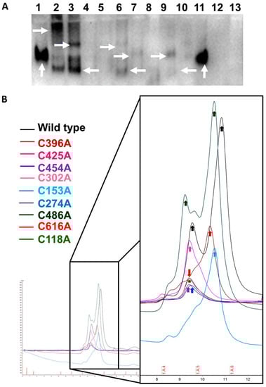 Altered complexation/Oligomerization of FXIII-B Cys mutants. Panel A. Western blot of rFXIII-B cysteine mutants after separation by native PAGE which were found to be secreted successfully (as detected by ELISA). Lanes: 1: Wild-Type; 2: C153A; 3: C118A; 4: C180A; 5: C267A; 6: C274A; 7: C396A; 8: C425A; 9: C454A; 10: C616A; and 11: rFXIII-B (Zedira, 75ng); 12: C302A. Vertical white arrows represent the Wild-type and rFXIII-B (Zedira GmbH, Darmstadt, Germany), whereas horizontal white arrows here indicate the diverse mobility of protein bands corresponding to FXIII-B (since the western blot has been probed with the mouse to human FXIII-B antibodies) Panel B. Gel-filtration chromatography of purified FXIII-B cysteine mutants. Color codes represent respective mutants indicated as inset in the figure. The x-axis denotes retention volume [ml], and the y-axis represents the amount of protein in mAU (UV-280nm).