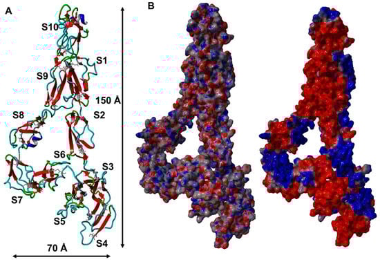 The FXIII-B subunit monomer model. Panel A shows the FXIII-B subunit monomer post-equilibrated model structure in ribbon format. The backbone is colored based on secondary structure. The disulfide-bonded cysteines are represented as grey colored stick forms. The individual sushi domains are numbered S1 to S10; N to C terminal. Panel B is the electrostatic surface representation of the FXIII-B subunit monomer model. The left side of Panel B shows the PBS styled depiction of surface electrostatics while the right side shows the PME styled depiction of surface electrostatic. Calculation and depiction for both forms of electrostatics were performed with macros embedded in YASARA. Red color indicates negative potential while blue represents positive potential.