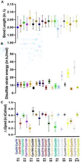 The disulfide bonds of the FXIII-B subunit monomer model displayed variability in bond length and dihedral energy during the production phase. The disulfide bonds showed bond length variability between 1.95–2.09 Å during their thermal motion which is typical of structural disulfide bonds []. The maximum bond length was observed for Cys153-Cys197 (2.06 + 0.05 Å) of S3 sushi domain during the production phase (Figure 5A). All disulfide bonds were typically right handed and left handed spiral forms which is also typical of structural disulfide bonds. The dihedral energies (or dihedral strain energies) for C-terminal disulfide bonds of sushi domains S8, S9 and S10, i.e., Cys were observed to be the highest amongst all disulfide bonds and also showed a high degree of variability (22.07 + 5.41, 25.21 + 5.01, and 30.21 + 16.26 kJ/moL, respectively) (Figure 5B). The change in free energy upon ablation of all disulfide bonds indicated a loss in stability with the highest loss in stability observed for the C180A variant present on S3 sushi domain (Figure 5C; ΔΔG = 0.73 + 0.11).