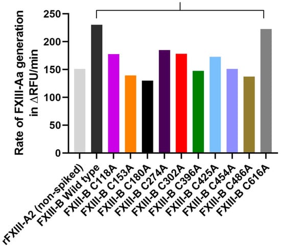 Effect of cysteine mutants on the rate of FXIII-Aa generation. This figure represents the comparative bar-plot representation of FXIII-Aa generation assay. The maximum rate of FXIII-Aa generation (µ) (in ∆RFU/min) upon spiking of FXIII-deficient plasma with 7 µg/mL rFXIII-A2 is represented in the x-axis, in the absence (grey bar), or presence (color-coded bars) of rFXIII-B2 subunits or FXIII-B cysteine mutants (10µg/mL each).
