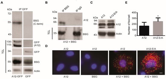 A disintegrin and metalloproteinase (ADAM)-12 interacts with basigin (BSG) in human cells. (A) 293-VnR cells were transfected with A12-GFP or GFP alone, immunoprecipitated with a polyclonal anti-GFP antibody and analyzed by Western blot, using an antibody against the C-terminal part of BSG. Total cell lysates (TCL) were tested for A12-GFP (pro and mature forms) and endogenous BSG protein expression. Actin was used as the loading control. (B) 293-VnR cells were co-transfected with A12 and full-length BSG, immunoprecipitated with an antibody against BSG and analyzed by Western blot, using a rabbit polyclonal antibody against A12. Immunoprecipitation with control rabbit IgG served as a negative control. (C) 293-VnR cells were transfected with A12 or the catalytically inactive A12-E/A mutant, together with full-length BSG and tested for A12 expression by Western blot, using actin as the loading control. (D) Cells from C were tested for A12-BSG co-localization by the proximity ligation assay (PLA) (red signal), using antibodies against the extracellular parts of A12 and BSG. Reactions using either of the two antibodies alone served as negative controls. Scale bar = 8 µm. (E) Number of red foci were automatically counted in 50 cells from three independent experiments, using MetaMorph microscopy analysis software. The average number of foci per cells ± SEM is shown in the graph. * p < 0.05, Student’s t-test.