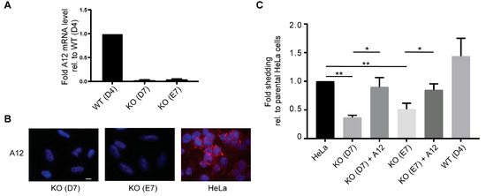 CRISPR/Cas9-mediated ADAM12 knockout reduces BSG reporter shedding. (A) qPCR analysis of A12 mRNA in CRISPR/Cas9 generated A12 knockout (clones D7 and E7) and non-edited wildtype (clone D4) HeLa cells. (B) Immunofluorescence staining of A12 in CRISPR/Cas9 generated A12 knockout HeLa clones (KO) D7 and E7, and parental HeLa cells. Nuclei were stained with 4′,6-diamidino-2-phenylindole (DAPI) and scale bar = 12 μm. (C) Fold shedding of BSG-AP transfected parental HeLa cells, CRISPR/Cas9-generated A12 knockout (KO) HeLa clones D7 or E7 with or without A12 re-expressed, and the non-edited wildtype (WT) clone D4, as indicated. Values represent means ± SEM from three independent experiments. * p < 0.05, ** p < 0.005, ANOVA.