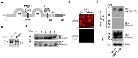 BSG is upregulated in several types of tumors, and soluble BSG concentrations in blood or urine from cancer patients correlate with disease stage and poor prognosis [9,10]. Furthermore, BSG associates with chemotherapy response and survival in bladder cancer [11]. Full-length BSG can be released from tumor cells, macrophages, and stromal cells through micro-vesicle or exosome secretion [3]. However, BSG can also be released into the circulation as a soluble form through proteolytic shedding of its extracellular part (ectodomain). For example, Tang et al. showed a MMP-dependent generation of soluble BSG, lacking the C-terminal part [12], and Egawa et al. demonstrated that MMP14 sheds a 22-kDa N-terminal fragment of BSG into the media of tumor cells [13]. Also, it was recently shown that cholesterol-depletion induces ectodomain shedding of BSG by a disintegrin and metalloproteinase (ADAM)-10 in tumor cells [14].