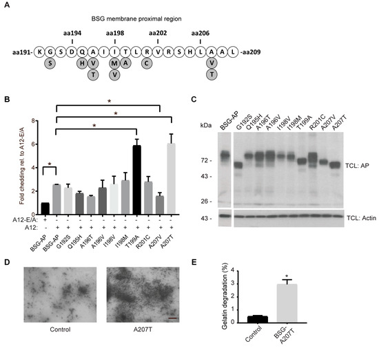 Cancer-associated BSG mutants are differentially shed by ADAM12. (A) Illustration of cancer-associated mutations (marked in grey) in the extracellular membrane proximal region (aa. 190–208) of BSG, identified in the Catalogue Of Somatic Mutations In Cancer (COSMIC) database (BSG, ENST00000333511; August 2017). (B) Fold shedding in 293-VnR cells transfected with A12 or the catalytically inactive A12-E/A mutant together with wildtype (BSG-AP), or various BSG-AP point mutations identified in (A). (C) Western blot of AP in total cell lysates (TCL) from cells in (B). Actin was used as loading control. (D) In situ gelatinase assay, using HT1080 cells grown on Oregon green-labeled gelatin and treated with conditioned media from untransfected 293-VnR cells (control) or 293-VnR cells transfected with ADAM12 together with a full-length BSG expression construct harboring the A207T mutation. Dark areas (without green fluorescence) represent gelatin degradation, scale bar = 10 µm. (E) Gelatin degradation was measured in µm2 for 27 images, using MetaMorph software and the percentage degradation was calculated. For both graphs, values represent means ± SEM from three independent experiments. * p < 0.05, Student’s t-test or ANOVA.