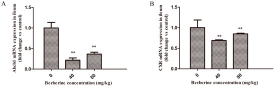 The effect of berberine on Abcb1 and chicken xenobiotic receptor (CXR) mRNA levels in broilers. (A) Abcb1. (B) CXR. Data are represented as mean ± SEM of three independent experiments. ** p < 0.01.