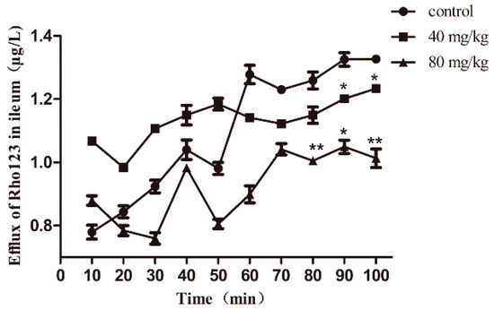 Mean Rho123 concentrations vs. time curves in the jejunum of broilers after oral administration of berberine for 24 h. Each point represents the mean ± SEM of six broilers. * p < 0.05; ** p < 0.01.