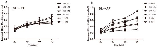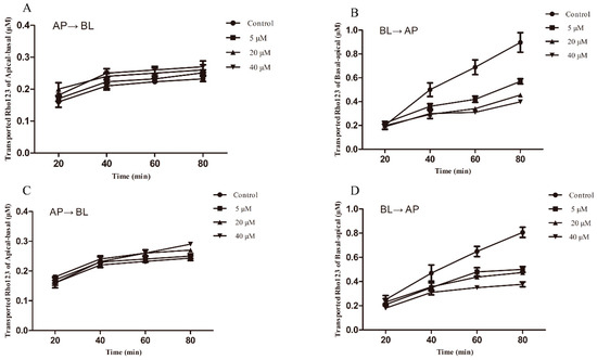 To confirm whether berberine affects the function of P-gp and the efficiency of inhibition, the bidirectional transport of Rho123 (a classical P-gp substrate) was evaluated using MDCK-chAbcb1 cells. Verapamil (a potent inhibitor of P-gp) served as a positive control. Cells were seeded in a 12-well Transwell plate (Corning, Acton, MA, USA) at a density of 1.0 × 105 cells/well and cultured for 5 days until the transepithelial electrical resistance values were greater than 300 Ω cm2. First, the monolayers were preincubated with Hank’s balanced salt solution either alone or with berberine (5, 20, and 40 μM) or verapamil (10, 50, 100, 1000, and 5000 μM) for 2 h or with berberine (5, 20, and 40 μM) for 8 h. Then, the bidirectional transport of Rho123 was carried out by replacing the donor buffer with transport buffer containing the mixture of Rho123 (4 mM) and the indicated concentrations of berberine or verapamil. The samples were collected at 20, 40, 60, and 80 min from the receiving sides and analyzed by HPLC.