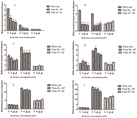 Bi-directional transport of difference chicken P-gp substrates across MDCK-chAbcb1 cell monolayer after pre-treatment with berberine for 2 h. (A) Tilmicosin. (B) Ciprofloxacin. (C) Clindamycin. (D) Sulfadiazine. (E) Ampicillin. (F) Enrofloxacin. Data are shown as mean ± SEM of three independent experiments. * p < 0.05; ** p < 0.01.
