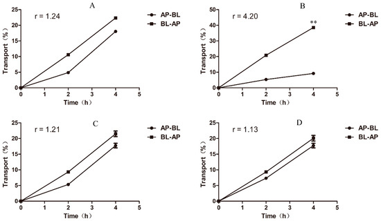 Bi-directional transport of berberine across MDCK and MDCK-chAbcb1 cell monolayers with or without verapamil (A) MDCK cell monolayer without verapamil. (B) MDCK-chAbcb1 cell monolayer without verapamil. (C) MDCK cell monolayer with verapamil. (D) MDCK-chAbcb1 cell monolayer with verapamil. Data are shown as mean ± SEM of three independent experiments. ** p < 0.01.