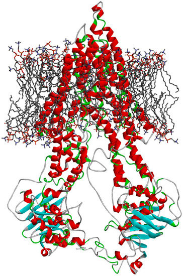 Final snapshot of the 1 ns molecular dynamics simulation of the CP-gp model build by homology modelling using I-TASSER homology modelling server and embedded in the POPC lipid bilayer. CP-gp is shown in the ribbon representation colored according to secondary structure, while the POPC molecules are shown in the stick representation (hydrogen atoms not shown for clarity).