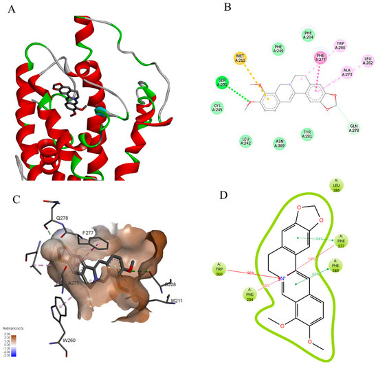 The previously reported homology model of CXR [15] was used to dock a set of small molecules and evaluate their affinity to the binding site of the ligand binding domain. The docking scores and poses agreed with the previous results, and the binding energy of −7.8 kcal/mol suggested that berberine interacts favorably with CXR (Table 4, Figure 8A). Out of 13 residues that interact with berberine in the docking pose (Figure 8B,C), 4 aromatic residues, F204, F249, W260, and F277 (Figure 8D), could be key sites responsible for the favorable binding, as they were observed in more than 50% of frames in molecular dynamics simulations.