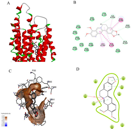 The docking pose of berberine (Figure 9A) and the score for the binding of berberine to CP-gp (−9.5 kcal/mol) indicated a higher affinity of berberine to the efflux pump than to CXR (Table 4). The position of berberine and residues that interact with CP-gp binding sites (Y315, F344, and F986, as depicted in Figure 9B,C) were consistent with the residues predicted by docking to be involved in berberine binding to mouse or human P-gp structures [13,16,17]. However, the molecular dynamics simulation of the CP-gp/berberine complex indicated that the key residues responsible for the dynamic interaction with berberine were F311, Y315, F991, and, importantly, Y318 (Figure 9D).