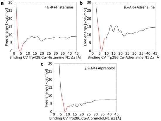 Free energy as a function of the binding CV calculated from the multiple walker metadynamics simulations. In each graph, the global minimum was set to zero. The part of the curve, for which the CV difference CV to the minimum is less or equal to 3 Å, is colored in red. (a) Histamine in complex with the H1 receptor, (b) adrenaline, and (c) alprenolol both in complex with the adrenoceptor.