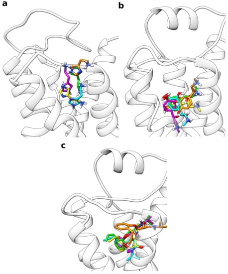 Overlay of the representative structures from all five ligand clusters calculated from the multiple walker simulations. With decreasing percentage of the frames, for which they are representative, the structures are colored in yellow (most populated), green, cyan, magenta, and orange (least populated). (a) Histamine in complex with the H1 receptor, (b) adrenaline, and (c) alprenolol both in complex with the adrenoceptor.