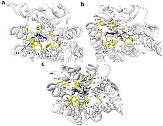 Docking is a very popular method because it has the advantage of being very fast, which allows screening multiple ligands in a short time. However, the method has also drawbacks like the limited ability to treat protein flexibility [,,]. This may in particular become problematic if the docked ligands differ significantly from the ligand that was used for the determination of the reference GPCR crystal structure []. In addition, most docking methods lack an explicit representation of the solvent and thus fail to detect water-mediated protein-ligand interactions [].